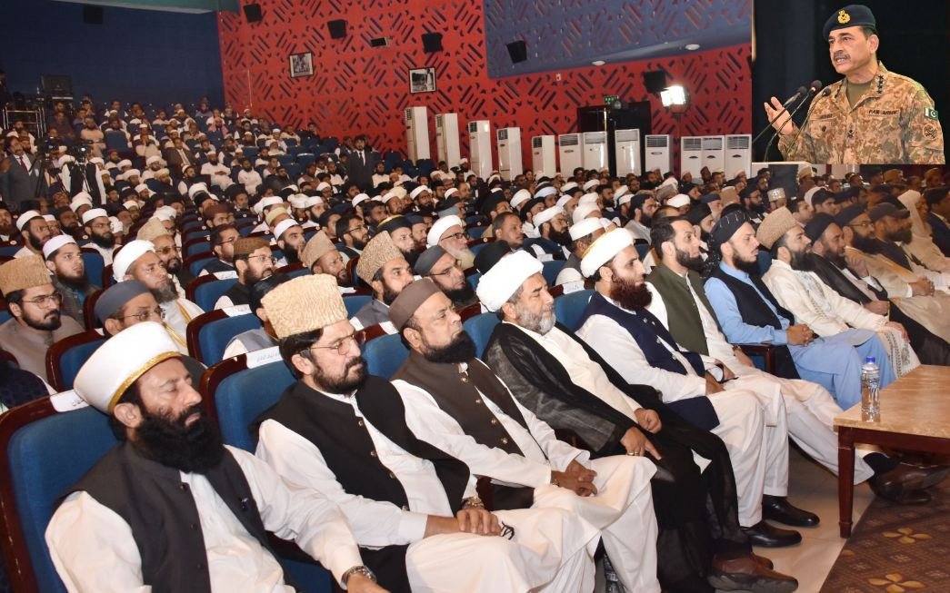 آرمی چیف نے کہا کہ ہم لوگوں کو کہتےہیں کہ اگر احتجاج کرنا ہے تو ضرور کریں لیکن پر امن رہیں۔ شدت پسندی پر بات کرتے ہوئے انہوں نے کہا کہ اللہ تعالیٰ کا فرمان ہے کہ دین میں جبر نہیں ہے۔ جرائم اور اسمگلرز مافیا دہشت گردی کی پشت پناہی کر رہے ہیں۔ سوشل میڈیا کے ذریعے انتشار پھیلایا جاتاہے ۔ ناموس رسالت پر بات کرتے ہوئے آرمی چیف نے کہا کہ کسی کی ہمت نہیں جو رسول پاک صلی اللہ علیہ وسلم کی شان میں گستاخی کر سکے۔جنرل سید عاصم منیر کا کہنا تھا کہ کسی نے پاکستان میں انتشار کی کوشش کی تو رب کریم کی قسم، ہم اس کے آگے کھڑے ہوں گے۔ دنیا کی کوئی طاقت پاکستان کو نقصان نہیں پہنچا سکتی کیوں کہ یہ ملک قائم رہنے کے لیے بنا ہے۔ اس پاکستان پر لاکھوں عاصم منیر، لاکھوں سیاستدان اور لاکھوں علما قربان کیونکہ پاکستان ہم سے زیادہ اہم ہے۔انہوں نے کہا کہ اگر ریاست کی اہمیت جاننی ہے تو عراق، شام اور لیبیا سے پوچھو۔ علما و مشائخ سے التماس ہے کہ وہ شدت پسندی یا تفریق کے بجائے تحمل اور اتحاد کی ترغیب دیں۔ علما کو چاہیے کہ وہ اعتدال پسندی کو معاشرے میں واپس لائیں اور فساد فی الارض کی نفی کریں۔ مغربی تہذیب اور رہن سہن ہمارا آئیڈیل نہیں ہے۔ ہمیں اپنی تہذیب پر فخر ہونا چاہیے۔