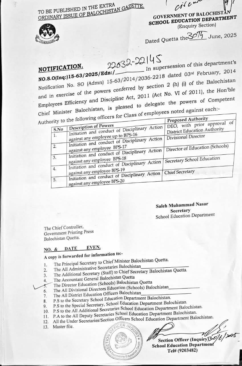 سیکرٹری ایجوکیشن سکولز بلوچستان کا نوٹیفکیشن: BEEDA ایکٹ کے تحت کاروائی کے اختیارات کی تقسیم