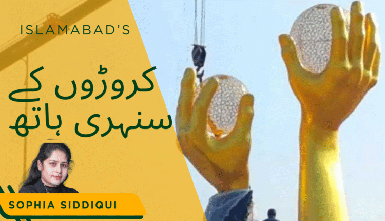 اسلام آباد کے سیکٹر D-12 میں رواں ہفتے اتوار کے دن نصب ہونے والے”Golden Hands” یعنی سنہری ہاتھ کا آرٹ ماڈل، جسے لاکھوں روپے کی لاگت سے ایک نجی کمپنی نے CSR یعنی کارپوریٹ سوشل رسپانسیبلٹی کے تحت تخلیق کیا تھا. پیر کی شام اس نمونے کو یہاں سے منتقل کرنے کا کام شروع کر دیا گیا… کہاں اور کس لیے… اس کا جواب معاشرے کو تلاش کرنا ہو گا.